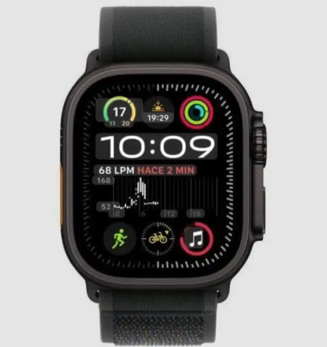 El Apple Watch Ultra 2 en su imponente acabado Black es una pieza de ingeniería superior. Su caja de 49 mm ofrece el equilibrio perfecto entre durabilidad y peso, protegiendo su pantalla capaz de alcanzar los 3,000 nits.