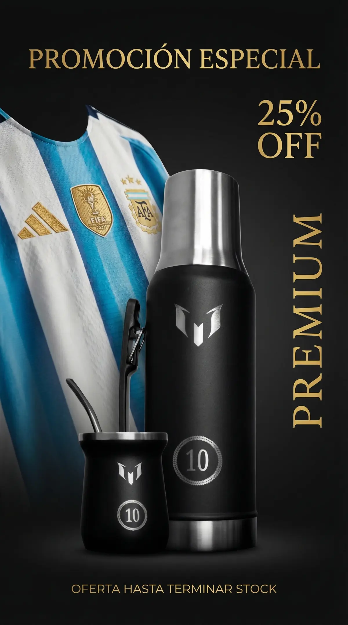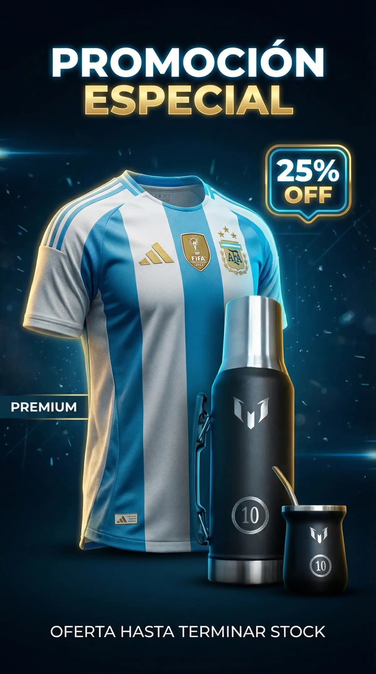 Camiseta de Argentina Premium + termo con mate Edicón limitada de Messi. -25% de Descuento, oferta por tiempo limitado. -10% Adicional con transferencia. Tarjetas de crédito/débito. Envío gratis a todo el país “Stock limitado”. Cuando se agota vuelve al precio original.