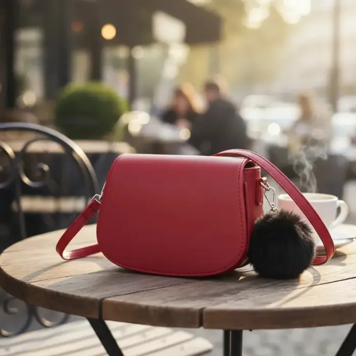 Su diseño minimalista y compacto la hace perfecta tanto para salidas casuales como para eventos. Puedes elegir entre la variante en color rojo con pompón negro o la variante en color verde azulado con pompón blanco, según disponibilidad en la publicación.
